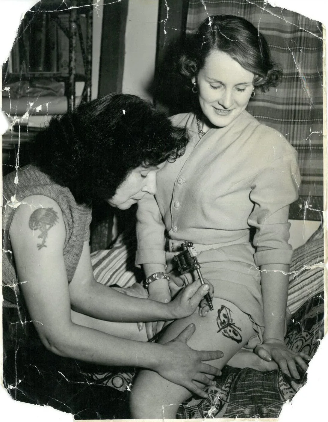 Born in 1904, Jessie Knight was the first and only female tattooist to work professionally in Britain for over 40 years. Her longtime love affair with tattooing was inherited from her father, who had traveled extensively as a sailor and worked as both a circus performer and a tattoo artist. Jessie spent most of her childhood traveling with her father as he performed daredevil acts and tattooed clients and performers. When Jessie was only 18, her father entrusted her to run the family tattoo shop in his absence, as he would be returning to sea. Jessie took over her father’s business successfully, consistently surprising clients with how young she was and the fact that she was a woman. At the point in time when Jessie started her career as a tattoo artist, tattoos were not commonplace in Britain. Reserved usually for sailors and ‘undesirables’, they were certainly not the norm for young women. Thus when married at age 27, Jessie faced her biggest obstacle in her career, her husband. His disapproval lead to Jessie taking a hiatus from tattooing lasting roughly around 8 years. Once Knight was able to escape the marriage and leave her old life behind, she opened up her first tattoo studio in 1936. As her business grew, she marketed herself as “Jessie Knight: Expert Freehand Lady Tattoo Artist”. Her unique freehand method was achieved by drawing on the skin with ink-soaked matchsticks and then tattooing over the stencil. She became recognized for her vivid use of color and detail in her designs. In 1955, Knight placed second in the ‘Champion Tattoo Artist of All England.’ Although she didn’t win the first prize, it was nonetheless a huge achievement, as at the time there were only a handful of female tattoo artists in the whole of Europe. She went on to own several successful tattoo shops throughout her life, becoming a trailblazer who helped break down barriers for the women tattooers who would come after her.