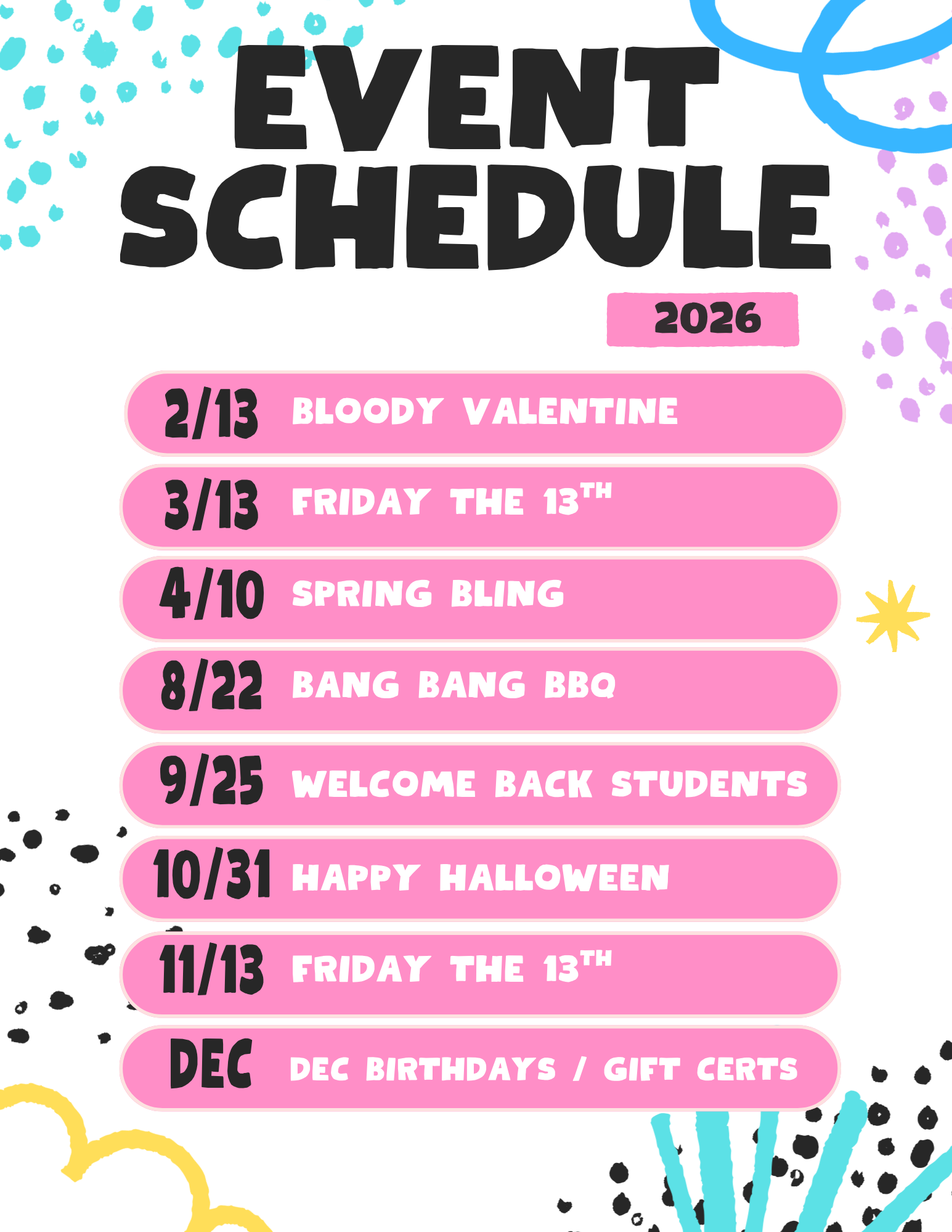 Our event schedule for the year!!
