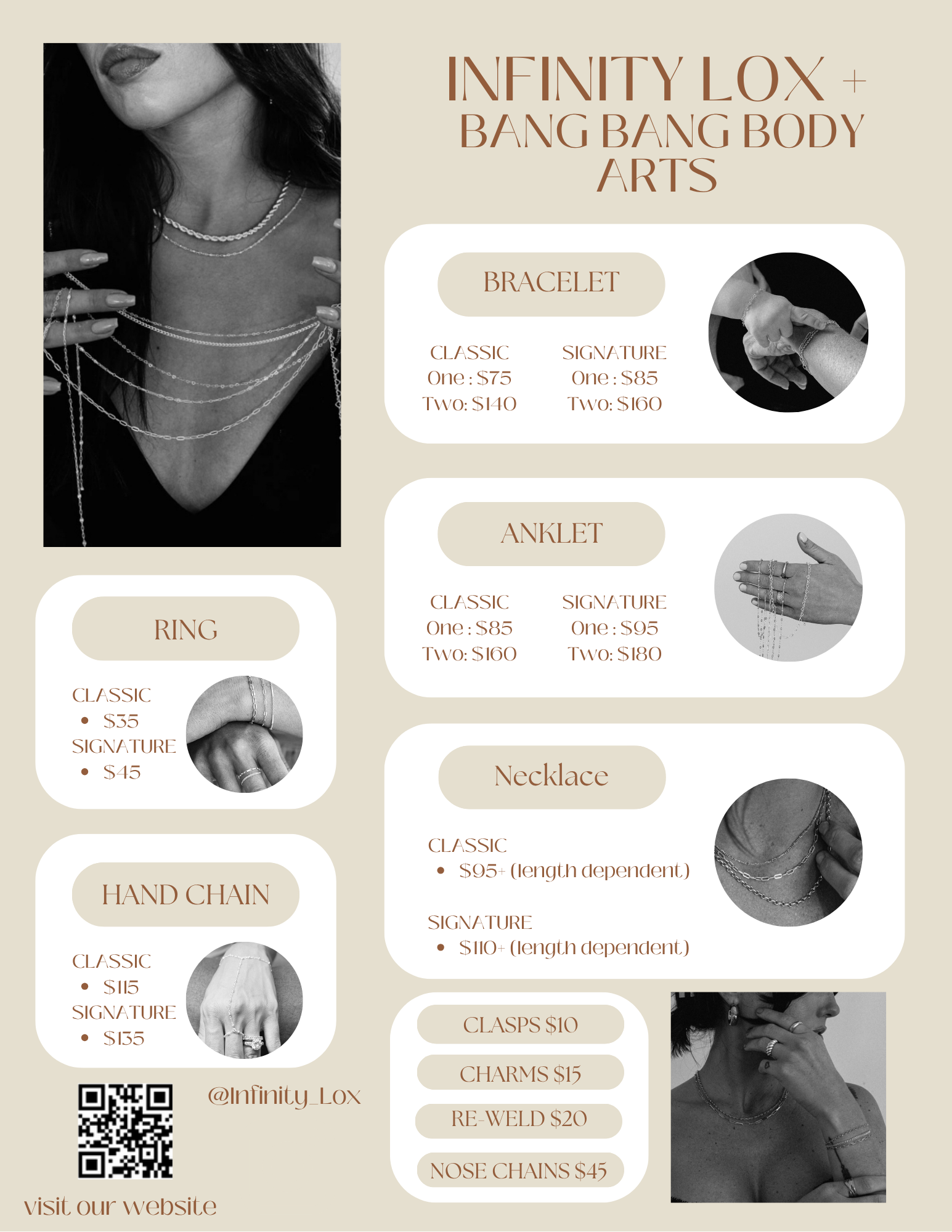 When it comes to all of your permanent jewelry needs, Bang Bang Body Arts has teamed up with Infinity Lox! Feel free to reach out to Sam or call the shop to book an appointment! We are always prepared to take walk-ins as well!